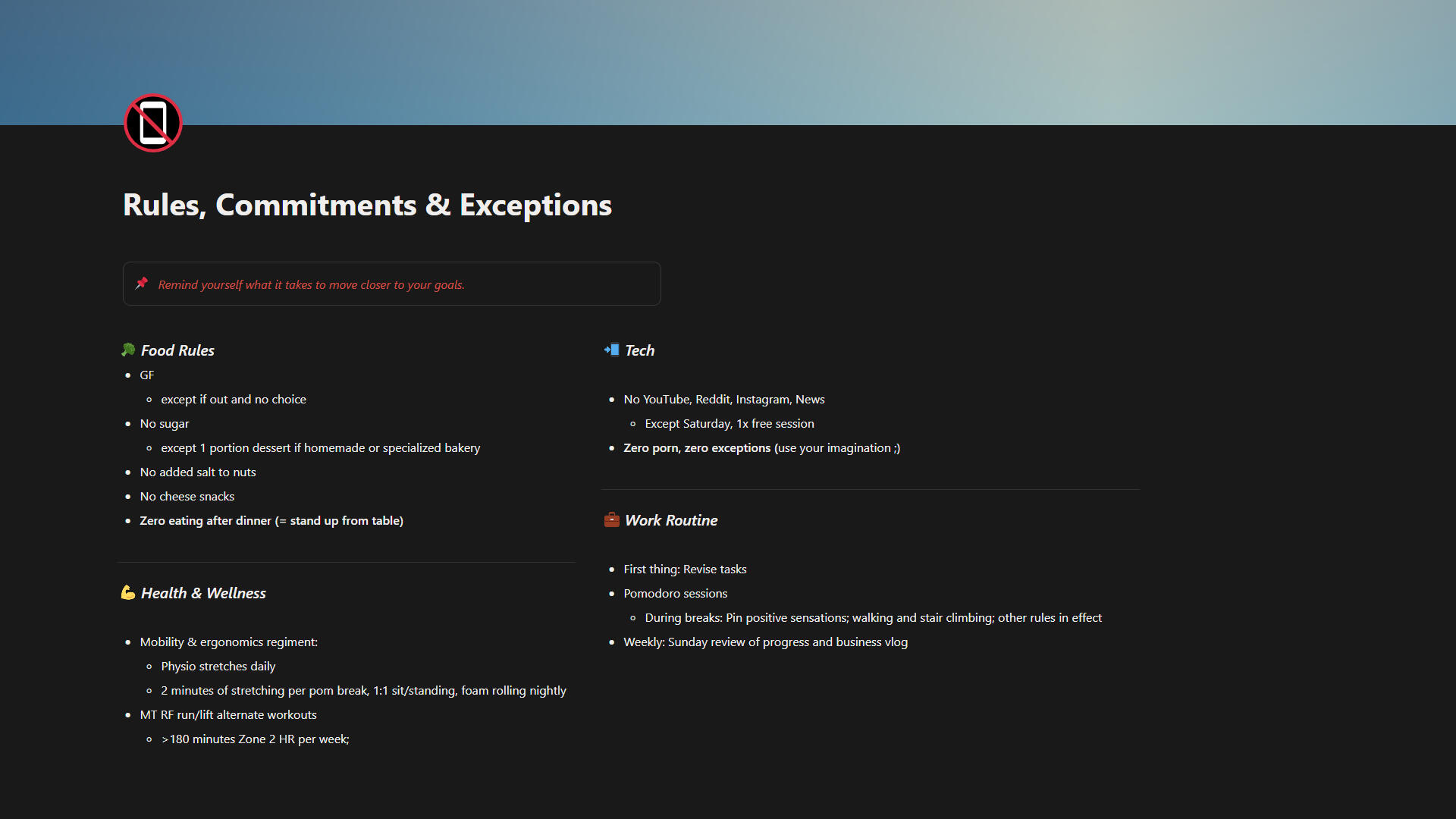 Ultimately, it’s about establishing and optimizing—through many iterations—the set of rules and commitments that are uniquely tailored to you. It’s also about refining other areas of your life: experimenting with systems, routines, and environmental conditions that enable you to live the best possible life—the life you want to live.